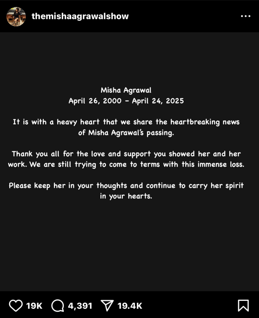 मीशा अग्रवाल 27 अप्रैल को अपना 25वां जन्मदिन मनाने वाली थीं। उनके परिवार और फैंस इस दिन का बेसब्री से इंतजार कर रहे थे। लेकिन जन्मदिन से ठीक दो दिन पहले, 25 अप्रैल को उनके निधन की खबर ने सबको हैरान कर दिया। उनके परिवार ने इंस्टाग्राम पर एक इमोशनल पोस्ट शेयर करते हुए लिखा, “भारी मन से हम आपको बताना चाहते हैं कि हमारी प्यारी मीशा अब हमारे बीच नहीं हैं। आप सभी ने उन्हें जो प्यार और सपोर्ट दिया, उसके लिए हम दिल से आभारी हैं। कृपया उन्हें अपनी यादों में जिंदा रखें और उनके लिए प्रार्थना करें।”